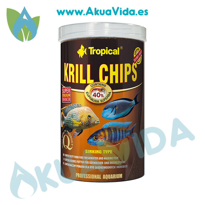 KRILL CHIPS Un alimento multi-ingrediente, potenciador del color, en forma de chips hundibles con alto contenido de Krill (40%). Destinado para la alimentación diaria de peces omnívoros y carnívoros de tanques dulces y salados.